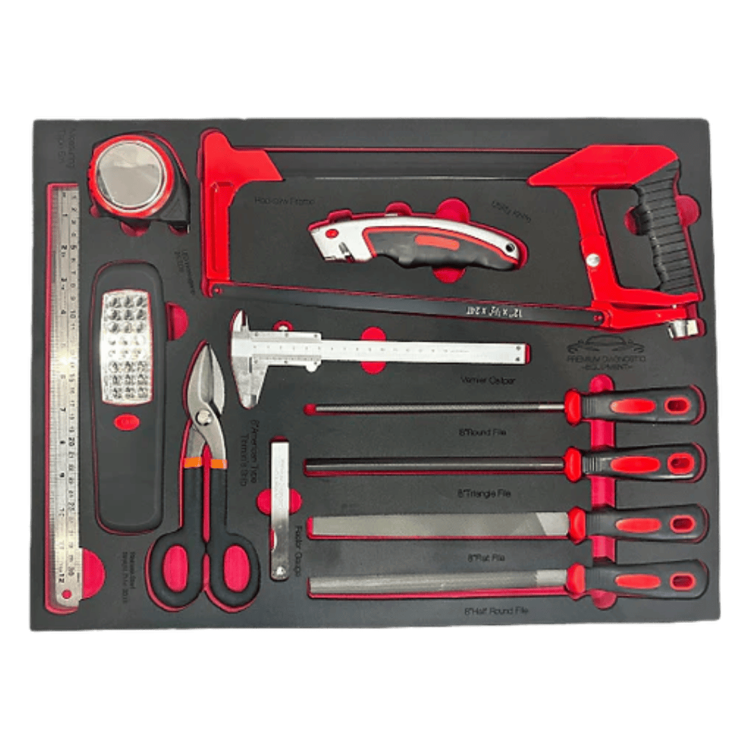 Crafted from high-density 40mm thick EVA foam, the tray features a sleek black skin color over a red foam base. It has been meticulously CNC machine-cut in three dimensions, ensuring precise tool cutouts for optimal tool protection. This organized and labeled tool control format promotes efficient workflow.