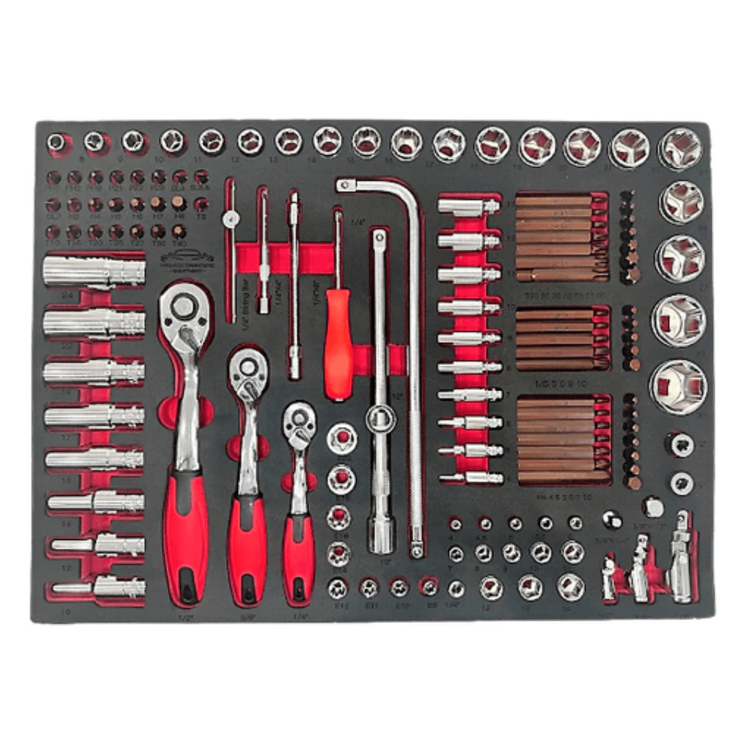 Crafted from high-density 40mm thick EVA foam, the tray features a sleek black skin color over a red foam base. It has been meticulously CNC machine-cut in three dimensions, ensuring precise tool cutouts for optimal tool protection. This organized and labeled tool control format promotes efficient workflow.